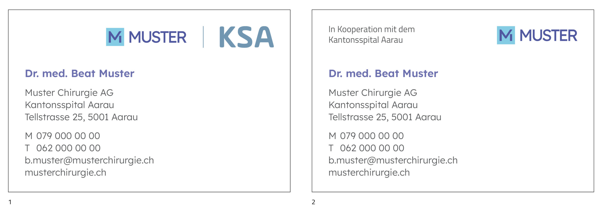 Das System mit der Trennlinie kann zum Beispiel auch gut auf Visitenkarten angewendet werden, wenn es sich dabei um eine Kooperation handelt (Abbildung 1). Ist die Anwendung von zwei Logos schwierig oder nicht gewünscht, kann auf der Visitenkarte auch nur textlich vermerkt werden, dass es sich um eine Kooperation handelt (Abbildung 2).