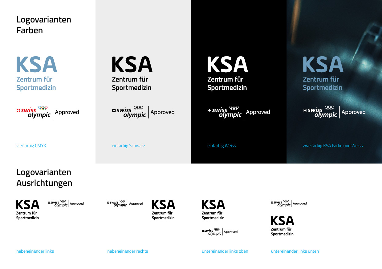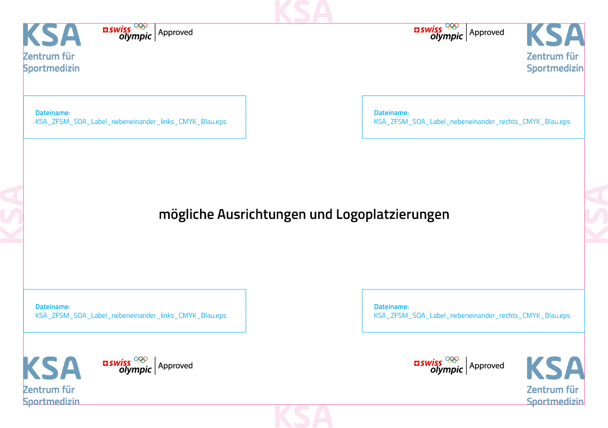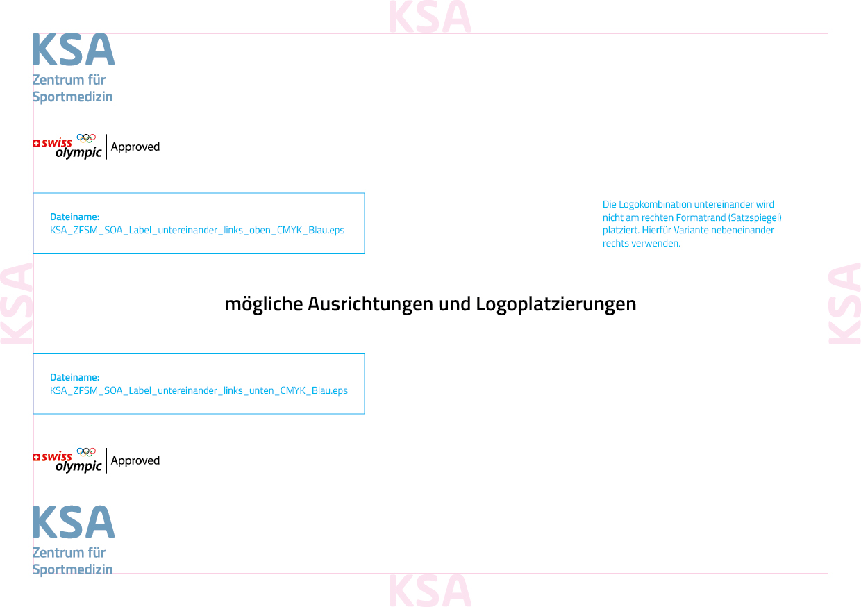 Für Umsetzungen mit dem Label «approved by Swiss Olympic» gibt es ein paar Designvorgaben zu beachten. Das Label tritt immer zusammen mit dem KSA Logo Zentrum für Sportmedizin als Absender auf (Medical Base). Die Grössenverhältnisse und Abstände von KSA Logo und Label sind fest definiert und dürfen nicht verändert werden (Logokombination). Bei der Gestaltung von Werbemitteln gelten die gleichen Layoutregeln und Logogrössen, wie beim ganzen KSA Markenauftritt. Die Logokombination darf in allen Ecken des Formates platziert werden, wobei das KSA Logo immer aussen am Satzspiegel ausgerichtet ist. Die Varianten und Ausrichtungen sind in unten abgebildeten Beispiel dargestellt und stehen als PDF und EPS-Dateien zum Herunterladen bereit. Das Logo KSA Zentrum für Sportmedizin besteht auch als einzelne Datei in allen Brandfarben und kann auch ohne das Label verwendet werden. Wenn immer möglich wird die 4-farbige Logovariante eingesetzt (auf weissem oder hellem Hintergrund). Ansonsten stehen die Farbversionen 1-farbig Schwarz oder Weiss und die 2-farbige Version mit einer KSA Brandfarbe und Weiss zur Verfügung. Bitte lassen Sie die Umsetzungen von der Abteilung Marketing und Kommunikation freigeben.