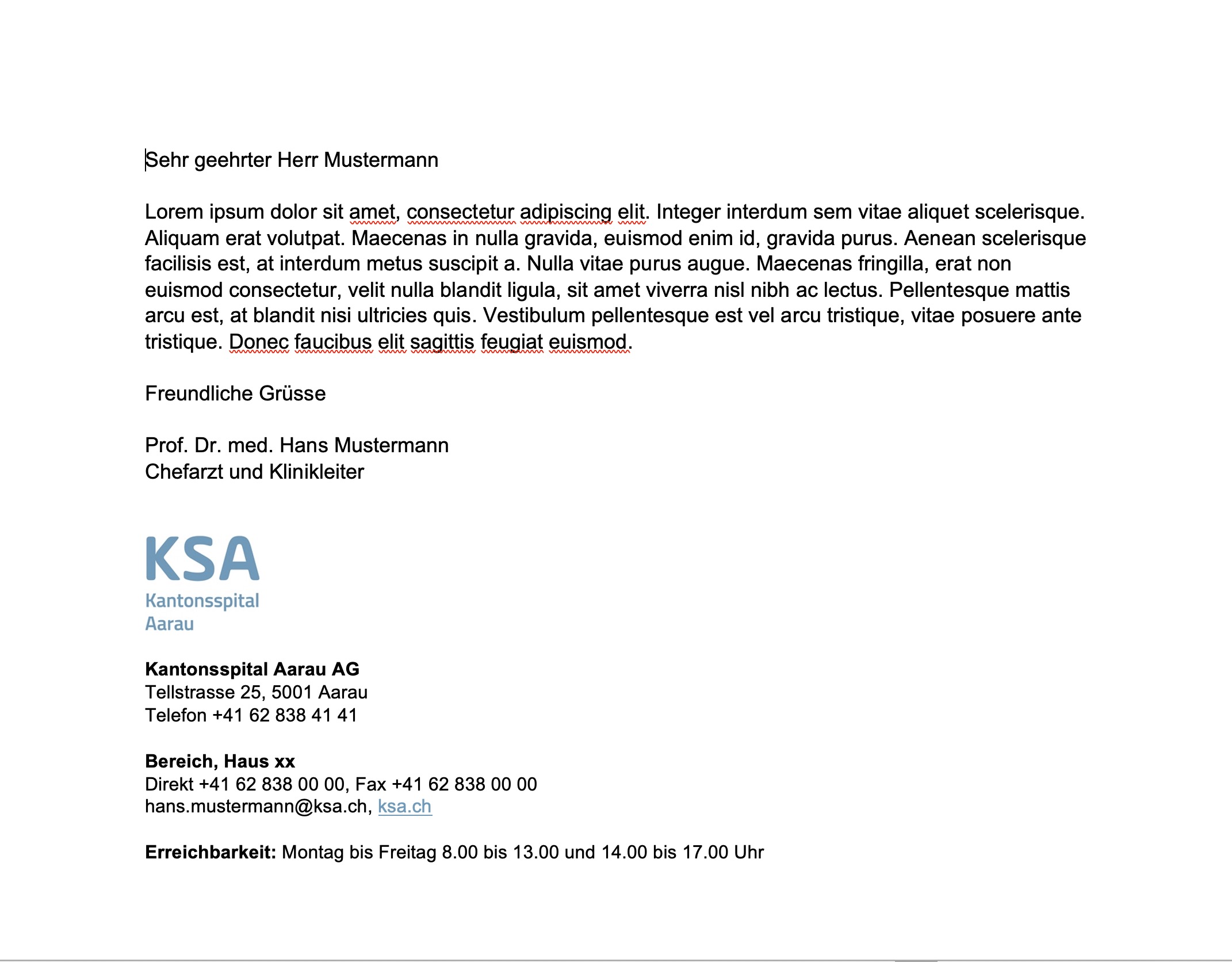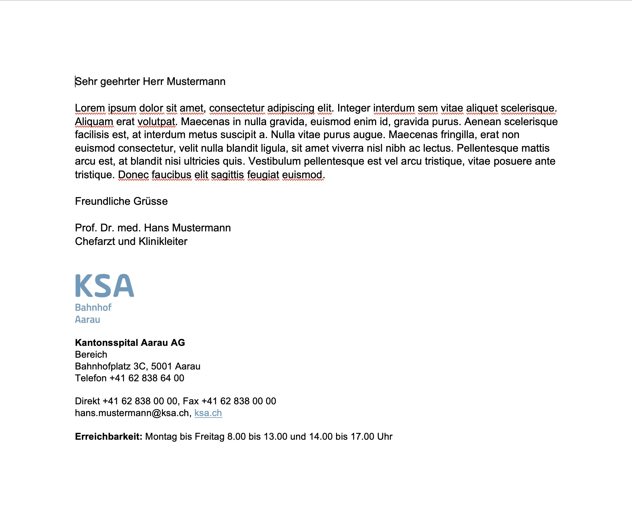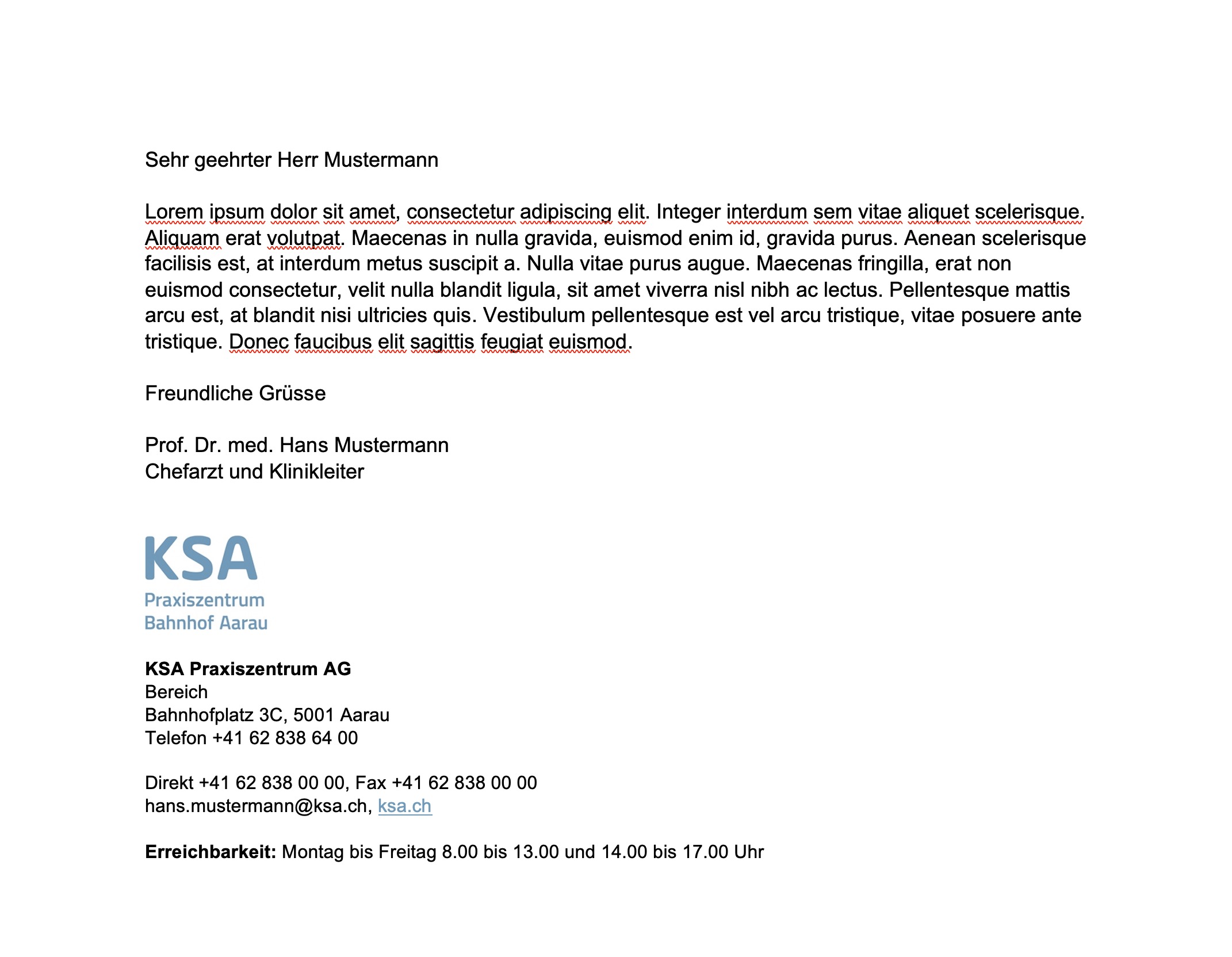 Für unsere E-Mail-Korrespondenz stehen die folgenden Signaturen zur Verfügung. Zur Übernahme der Schriftgrössen, Zeilenabständen und der Logoplatzierung wird empfohlen, die bereitgestellten Word-Dokumente zu nutzen, um deren Inhalt in den E-Mail-Client zu kopieren. Akademischer Titel, Name, Position, Bereich, Haus, Direktwahl, Faxnummer, E-Mail-Adresse sowie URL müssen jeweils individuell angepasst werden. Die Signatur beginnt ab der Grussformel und endet mit den Angaben zur Erreichbarkeit. Dieser Teil sollte im E-Mail-Client dementsprechend als Signatur hinterlegt werden. Die Angaben zum Lauftext müssen wiederum in den Grundeinstellungen des E-Mail-Clients angegeben werden.